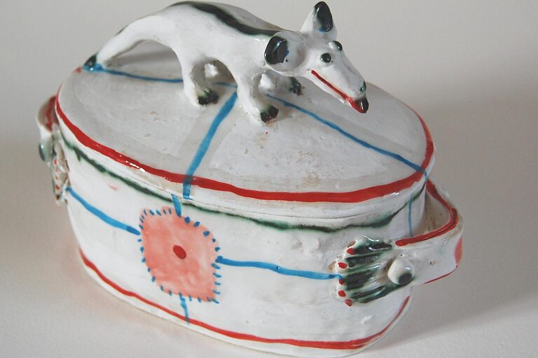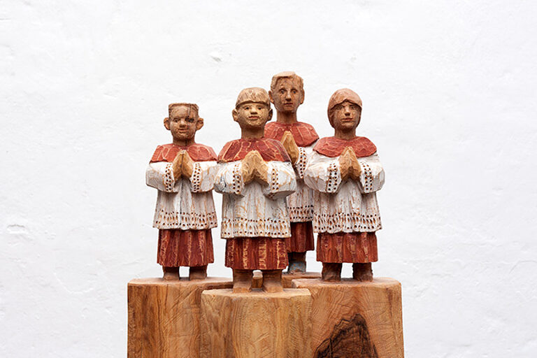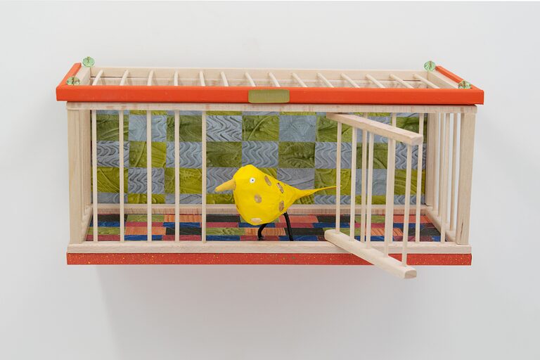 Auf liebgewonnene Gestalten wie die Klammervögel von Martin Lhoták, die gedrechselten Figuren von Urs Latus, die Tierskulpturen von Mikael Nilsson und die Männel von Friederike Curling-Aust freuen wir uns ganz besonders – kleine Botschafter der Freude und des Handwerks. Auch Kästchen, Lichtboxen und Behältnisse spielen eine besondere Rolle. Sie sind mehr als nur Aufbewahrungsorte – sie bergen Schätze. In den Arbeiten von Irmengard Matschunas, Maria Verburg und Adelheid Siegeroth öffnen sich kleine Räume voller Geheimnisse. Vasenschachteln und Goldfisch-Dioramen sind aus bunten Kleisterpapieren von Andreas Richter für die Ausstellung gebaut. Susanne Mansen thematisiert in ihren Keramikdosen das beengte Wohnen, auf ihren Fliesen wachsen Wolkenkratzer und Puppenstuben.