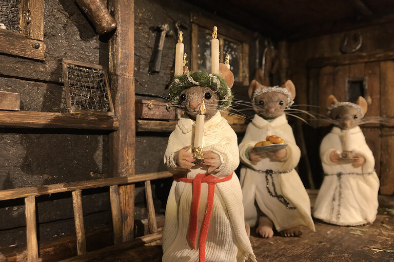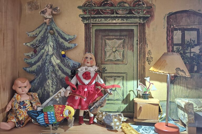 So zeigt Barbara Lorenz Höfer ihre »Weihnachtswünschehäuser« – eine Installation aus Briefen an das Christkind, den Weihnachtsmann oder die Liebsten, geschrieben zwischen 1900 und 2025. Ingvild Adelaine Eiring aus Norwegen präsentiert erstmals in der Galerie ihre bezaubernden Dioramen, detailreiche Innenräume, in denen etwa der Zug der Heiligen Lucia lebendig wird.