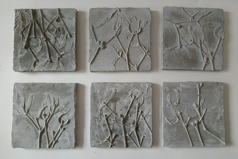 Vertraute Gewohnheiten treffen auf Bräuche, die an die Weihnachtszeit gebunden sind. Sophie Herz hat das Motiv des Mistelzweiges, unter dem man sich küsst, gewählt. Ihre kleinen Reliefs symbolisieren Glück, Liebe und Freundschaft. Lilli Zentgraf entführt uns mit ihren Räucherhäuschen und winterlichen Holzlandschaften in märchenhafte Welten, in denen Rauch, Duft und Erinnerung miteinander verschmelzen. Glitzernd bringen uns die Hinterglasbilder von Heike Pillemann in fröhlich-festliche Stimmung.